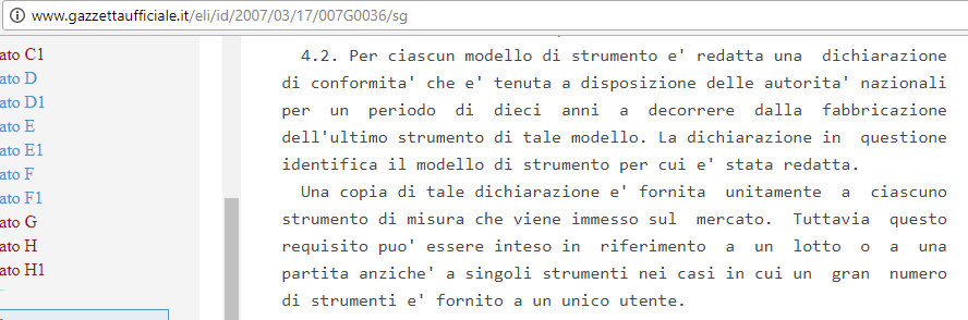Sul documento che vi abbiamo proposto doveva risultare la conformità alle direttive specifiche riguardanti i contatori di energia elettrica recepite nel nostro paese ossia la direttiva (CEE) n. 76/891 relativa ai contatori di energia elettrica. recepita nel nostro paese con il e men che meno alla direttiva (CEE) n. 71-316 relativa alle disposizioni comuni agli strumenti di misura ed ai metodi di controllo metrologico recepita nel nostro paese con il D.P.R. del 12 agosto1982, n. 798 del quale vi forniamo in allegato copia in formato PDF e che ad oggi non pare esser stato abrogato. D.P.R. del 10 settembre 1982, n. 872